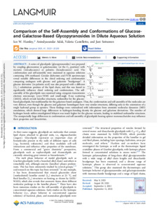 It is advisable to refer to the publisher's version if you intend to cite from this work. See Guidance on citing. To link to this item DOI: 10.1021/acs.langmuir.5c02346 Abstract/SummaryA series of glycolipids (glycopyranosides) was prepared by coupling glucosamine or galactosamine (at the C2 position) with myristic (tetradecanoic) or palmitic (hexadecanoic) acid. The conformation and self-assembly were examined in aqueous solutions containing 10% methanol. Circular dichroism and FTIR spectroscopy reveal notable differences in the chiral ordering and conformation comparing analogues with glucose and galactose “headgroups”. A glucose derivative (to palmitic acid) was also prepared with a different (C1-) substitution position of the lipid chain, and this was found to significantly influence chiral ordering and conformation. The self-assembly of the glycolipids was examined using cryogenic-transmission electron microscopy (cryo-TEM) and small-angle X-ray scattering (SAXS), which reveals lamellar structures, unilamellar for the glucose-based glycolipids, but multilamellar for the galactose-based analogues. Thus, the conformation and self-assembly of the molecules are very distinct, even though the glucose and galactose homologues have very similar structures, differing only in the orientation of a single hydroxyl group as epimers. These findings were rationalized with information from atomistic molecular dynamics (MD) simulations, which showed large differences in hydrogen-bonding density for glucose and galactose derivatives. The number of hydrogen bonds within interdigitated bilayers was much higher for the glucose variants, leading to stabilized unilamellar structures. The unexpectedly large differences in conformation and self-assembly of glycolipids bearing epimer monosaccharides may influence their properties and bioactivities.