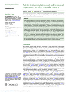 It is advisable to refer to the publisher's version if you intend to cite from this work. See Guidance on citing. To link to this item DOI: 10.1017/pen.2025.10003 Abstract/SummaryAbstract Social rewards (e.g. smiles) powerfully shape human behavior, starting from early childhood. Yet, the neural architecture that enables differential processing of social and nonsocial rewards remains largely unknown. Few previous studies that directly compared social vs nonsocial stimuli have used stimuli that have low ecological validity or are not matched on low-level stimulus parameters – limiting the scope of inference. To address this gap in knowledge, social and nonsocial reward images taken from the real world were matched on valence, arousal, and key low-level stimulus properties and presented to 37 adults in a functional magnetic resonance imaging (fMRI) study. Individual self-reported preference for social images was associated with the functional connectivity between the left anterior insula (LAI) and medial orbitofrontal cortex (mOFC), as well as that between the left Fusiform Gyrus (LFG) and the Anterior Cingulate Cortex (ACC). Autistic traits negatively modulated LAI – mOFC connectivity and LFG – ACC connectivity. Reduced functional connectivity between these regions may contribute to the lower social reward responsivity in individuals with high autistic traits, as also noted from their lower valence ratings to social rewards. This study provides evidence for a new experimental paradigm to test social reward processing at a behavioral and neural level, which can contribute to potential transdiagnostic biomarkers for social cognitive processes.