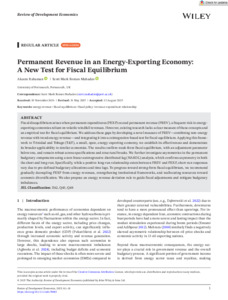 It is advisable to refer to the publisher's version if you intend to cite from this work. See Guidance on citing. To link to this item DOI: 10.1111/rode.70043 Abstract/SummaryFiscal disequilibrium arises when permanent expenditures (PEXP) exceed permanent revenue (PREV), a frequent risk in energy-exporting economies reliant on volatile windfall revenues. However, existing research lacks a clear measure of these concepts and an empirical test for fiscal equilibrium. We address these gaps by developing a novel measure of PREV—combining non-energy revenue with trend energy revenue—and integrating it into a cointegration-based test for fiscal equilibrium. Applying this framework to Trinidad and Tobago (T&T), a small, open, energy-exporting economy, we establish its effectiveness and demonstrate its broader applicability to similar economies. The results confirm weak-form fiscal equilibrium, with an adjustment parameter below one, and remain robust across specifications and structural breaks. We further investigate asymmetries in the permanent budgetary components using a non-linear autoregressive distributed lag (NARDL) analysis, which confirms asymmetry in both the short and long-run. Specifically, while a positive long-run relationship exists between PREV and PEXP, short-run responses vary due to pre-defined budgetary allocations and time lags. To progress toward strong-form fiscal equilibrium, we recommend gradually decoupling PEXP from energy revenues, strengthening institutional frameworks, and reallocating resources toward economic diversification. We also propose an energy revenue deviation rule to guide fiscal adjustments and mitigate budgetary imbalances.