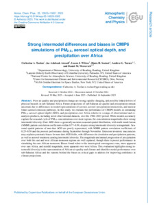 It is advisable to refer to the publisher's version if you intend to cite from this work. See Guidance on citing. To link to this item DOI: 10.5194/acp-25-10523-2025 Abstract/SummaryPoor air quality and precipitation change are strong, rapidly changing, and possibly linked drivers of physical hazards in sub-Saharan Africa. Future projections of sub-Saharan air quality and precipitation remain uncertain due to differences in model representations of aerosol, aerosol–precipitation interactions, and unclear future aerosol emission pathways. In this study, we evaluate the performance of CMIP6 models in simulating PM2.5, aerosol optical depth (AOD), and precipitation over Africa relative to a range of observational and re- analysis products, including novel observational datasets, over the 1981–2023 period. While models accurately capture the seasonal cycle of PM2.5 concentrations over most regions, the concentration magnitudes show strong intermodel diversity. Dust AOD shows a generally accurate seasonal spatial distribution, with multi-model mean (MMM) pattern correlation coefficients within 0.77–0.94, despite strong intermodel diversity in magnitude. Sea- sonal spatial patterns of non-dust AOD are poorly represented, with MMM pattern correlation coefficients of 0.25–0.58 and the poorest performance during September through November. Emission inventory inaccuracies may explain systematic biases for non-dust AOD fields, with differences in circulation and precipitation patterns, as well as aerosol treatment causing intermodel diversity. The magnitude and annual progression of precipitation over both the east and west African monsoon regions are well captured, though there is poorer performance in simulating the east African monsoon. Biases found relate to the intertropical convergence zone, more apparent over east Africa, and rainfall magnitude, more apparent over west Africa. This evaluation highlights strong in- termodel diversity in the representation of African air quality and climate and identifies model performance over sub-Saharan Africa and the reasons behind the biases as critical gaps to address for improving confidence in climate projections.