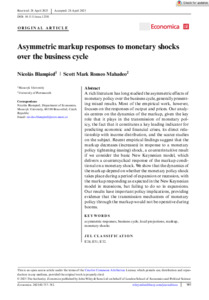 It is advisable to refer to the publisher's version if you intend to cite from this work. See Guidance on citing. To link to this item DOI: 10.1111/ecca.12581 Abstract/SummaryA rich literature has long studied the asymmetric effects of monetary policy over the business cycle, generally presenting mixed results. Most of the empirical work, however, focuses on the responses of output and prices. Our analysis centres on the dynamics of the markup, given the key role that it plays in the transmission of monetary policy, the fact that it constitutes a key leading indicator for predicting economic and financial crises, its direct relationship with income distribution, and the scarce studies on the subject. Recent empirical findings suggest that the markup decreases (increases) in response to a monetary policy tightening (easing) shock, a counterintuitive result if we consider the basic New Keynesian model, which delivers a countercyclical response of the markup conditional on a monetary shock. We show that the dynamics of the markup depend on whether the monetary policy shock takes place during a period of expansion or recession, with the markup responding as expected in the New Keynesian model in recessions, but failing to do so in expansions. Our results have important policy implications, providing evidence that the transmission mechanism of monetary policy through the markup would not be operative during booms.