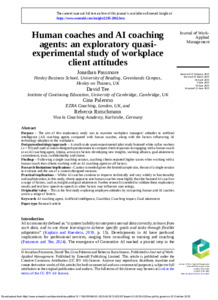 It is advisable to refer to the publisher's version if you intend to cite from this work. See Guidance on citing. To link to this item DOI: 10.1108/jwam-02-2025-0032 Abstract/SummaryPurpose The aim of this exploratory study was to examine workplace managers’ attitudes to artificial intelligence (AI) coaching agents compared with human coaches, along with the factors influencing AI technology adoption in the workplace. Design/methodology/approach A small-scale quasi-experimental pilot study featured white collar workers (n = 63) and used a custom-designed questionnaire to compare client responses to engaging with a human coach or an AI coaching agent, Alpina, across six factors: developing new insights, working alliance, goal attainment, commitment, trust, confidentiality and shame. Findings Following a single coaching session, coaching clients reported higher scores when working with a human coach than clients working with an AI coaching agent on all factors. Research limitations/implications Caution is needed given the limited sample size, the use of a single session to evaluate and the use of a custom-designed measure. Practical implications Whilst AI coaches continue to improve technically and vary widely in functionality and sophistication, in this study, clients appear to rate human coaches more highly than the featured AI coach on a range of factors, such as insights and goal attainment. Further research is needed to validate these exploratory results and test how speech-to-speech or other factors may influence user ratings. Originality/value This is the first study exploring employee attitudes by comparing human and AI coaches across a range of factors.