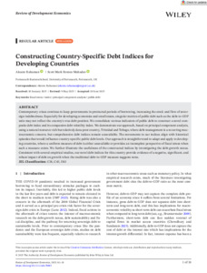 It is advisable to refer to the publisher's version if you intend to cite from this work. See Guidance on citing. To link to this item DOI: 10.1111/rode.70003 Abstract/SummaryContemporary crises continue to keep governments in protracted periods of borrowing, increasing the stock and flow of sovereign indebtedness. Especially for developing economies and small states, singular metrics of public debt such as the debt-to-GDP ratio may not reflect the country's true debt position. We consolidate various indicators of public debt to construct a novel composite debt index and its companion debt volatility index. We demonstrate our approach, based on principal component analysis, using a natural resource-rich but relatively data-poor country, Trinidad and Tobago, where debt management is a recurring macroeconomic concern, but comprehensive debt indices remain unavailable. The movements in our indices align with historical episodes that would influence country-specific public debt levels. Our approach is straightforward to adapt and apply to developing countries, where a uniform measure of debt is either unavailable or provides an incomplete perspective of fiscal stress when such a measure exists. We further illustrate the usefulness of the constructed indices by investigating the debt-growth nexus. Consistent with several empirical studies, our novel debt indices for this country provide evidence of a negative, significant, and robust impact of debt on growth when the traditional debt-to-GDP measure suggests none.