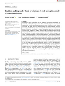 It is advisable to refer to the publisher's version if you intend to cite from this work. See Guidance on citing. To link to this item DOI: 10.1111/risa.17706 Abstract/SummaryFlood models, while representing our best knowledge of a natural phenomenon, are continually evolving. Their predictions, albeit undeniably important for flood risk management, contain considerable uncertainties related to model structure, parameterisation, and input data. With multiple sources of flood predictions becoming increasingly available through online flood maps, the uncertainties in these predictions present considerable risks related to property devaluation. Such risks stem from real estate decisions, measured by location preferences and willingness-to-pay to buy and rent properties, based on access to various sources of flood predictions. Here, we evaluate the influence of coastal flood predictions on real estate decision-making in the UK by adopting an interdisciplinary approach, involving flood modelling, novel experimental willingness-to-pay real estate surveys of UK residents in response to flood predictions, statistical modelling, and geospatial analysis. Our main findings show that access to multiple sources of flood predictions dominates real estate decisions relative to preferences for location aesthetics, reflecting a shift in demand towards risk-averse locations. We also find that people do not consider flood prediction uncertainty in their real estate decisions, possibly due to an inability to perceive such uncertainty. These results are robust under a repeated experimental survey using an open access long-term flood risk map. We, therefore, recommend getting flood models ‘right’ but recognise that this is a contentious issue because it implies having an error-free model, which is practically impossible. Hence, to reduce real estate risks, we advocate for a greater emphasis on effectively communicating flood model predictions and their uncertainties to non-experts.