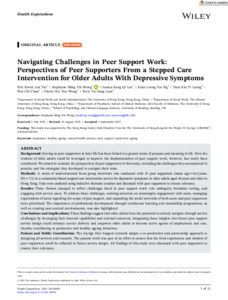 It is advisable to refer to the publisher's version if you intend to cite from this work. See Guidance on citing. To link to this item DOI: 10.1111/hex.70430 Abstract/SummaryServing as peer supporters in later life has been linked to a greater sense of purpose and meaning in life. How the wisdom of older adults could be leveraged to improve the implementation of peer support work, however, has rarely been considered. We aimed to examine the perspectives of peer supporters in this study, including the challenges they encountered in practice and the strategies they developed to navigate their roles. Methods: A series of semi‐structured focus group interviews was conducted with 23 peer supporters (mean age = 66.2 years, SD = 7.1) in a community‐based stepped‐care intervention service for depressive symptoms in older adults aged 60 years and older in Hong Kong. Data were analysed using inductive thematic analysis and discussed with peer supporters to ensure relevance. Results: Three themes emerged to reflect challenges faced in peer support work: role ambiguity, boundary setting, and engaging with service users. To address these challenges, centring attention on meaningful engagement with users, managing expectations of users regarding the scope of peer support, and expanding the social networks of both users and peer supporters were prioritised. The importance of professional development through continuous learning and mentorship programmes, as well as creating user‐centred environments, was also highlighted. Conclusions and Implications: These findings suggest that older adults have the potential to actively navigate through service challenges by leveraging their internal capabilities and external resources. Integrating these insights into future peer support service design could enhance service delivery and empower older adults to become active agents of employment and care, thereby contributing to productive and healthy ageing initiatives. Patient and Public Contribution: The Joy Age Peer Support network adopts a co‐production and partnership approach to designing all services and research. The present work was part of an effort to ensure that the lived experiences and wisdom of peer supporters could be reflected in future service design. All findings of this study were discussed with peer supporters to ensure their relevance.