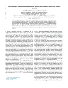It is advisable to refer to the publisher's version if you intend to cite from this work. See Guidance on citing. To link to this item DOI: 10.1103/1slf-41nm Abstract/SummaryPhysical aging in polymers is a fundamental yet poorly understood phenomenon, as diverse macromolecular systems exhibit remarkably similar slow dynamics. Through molecular dynamics simulations of physically crosslinked networks composed of semiflexible polymers, we identify a previously unexplored class of self-similar aging. The network undergoes ultra-slow coarsening characterized by a logarithmically growing mesh size, L(t)∼ln t, which governs the spatial organization, cohesive and bending energies, and the aging dynamics of the system. This single time-dependent length scale defines an internal clock, giving rise to spatio-temporal self-similarity of both structure and dynamics – offering a perspective on aging in soft and disordered materials.