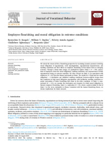 It is advisable to refer to the publisher's version if you intend to cite from this work. See Guidance on citing. To link to this item DOI: 10.1016/j.jvb.2025.104171 Abstract/SummaryWe extend the extant call for a flourishing perspective by examining dynamic processes involving moral obligations of organizations, work meaningfulness, organizational responsiveness, and enabling conditions and their effects on employee flourishing in four studies from an emerging economy. Through a mixed-study design, we qualitatively explore (Study 1: N = 146), perceptions of employees about the moral obligations, enabling conditions, and responsiveness of their organizations during an extreme condition. We then conduct (in Study 2) an experiment with employees (N = 63) from the Kumasi metropolis in Ghana. The results of a 2 (high and low moral obligation) × 2 (facilitative and inhibitive enabling conditions) between-subjects design show that employees in high moral obligation organizations with facilitative enabling conditions reported perceptions of better flourishing than those in the other conditions. In Study 3, cross-sectional (N = 112), we examine the mechanism and dynamics by which moral obligation influences employee flourishing. Study 4, a replication (N = 81), shows a pattern similar to that of Study 2 in the Accra metropolis in Ghana. Consistent with the human flourishing theory, we discuss implications for future research.