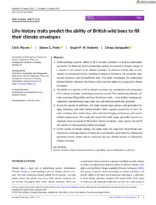 It is advisable to refer to the publisher's version if you intend to cite from this work. See Guidance on citing. To link to this item DOI: 10.1111/een.70023 Abstract/SummaryUnderstanding a species’ ability to fill its climate envelope is crucial to understanding barriers to dispersal, and for predicting capacity to respond to climate change. If a species is not present in its climate envelope, its absence is likely due to non-climatic environmental factors including 1) dispersal limitations; 2) unsuitable habitat and resources and 3) insufficient data. This study investigates the relationship between British wild bees’ life-history traits and their ability to occupy their climate envelopes. The ability of a species to fill its climate envelope was calculated as the proportion of its climate envelope containing a presence record. The relationship between climate envelope filling ability and four life-history traits - lecty (pollen foraging specialisation), overwintering stage, body size and habitat breadth was assessed. Across 64 species of wild bee this study reveals large species, with generalist foraging behaviour and wide habitat breadth, filled a greater proportion of their climate envelope than smaller bees, with restricted foraging preferences and narrow habitat requirements. This study also found that while larger, generalist species are relatively more successful at filling their climate envelopes, many species do not fill the entirety of their potential climate envelopes. In the context of climate change, this study raises the issue that Great Britain may experience a homogenization of future bee communities, dominated by widespread generalist species, better able to overcome the non-climatic barriers to filling their climate envelope.