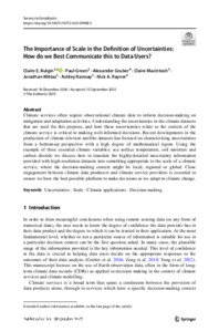 It is advisable to refer to the publisher's version if you intend to cite from this work. See Guidance on citing. To link to this item DOI: 10.1007/s10712-025-09908-5 Abstract/SummaryClimate services often require observational climate data to inform decision-making on mitigation and adaptation activities. Understanding the uncertainties in the climate datasets that are used for this purpose, and how these uncertainties relate to the context of the climate service is critical to making well-informed decisions. Recent developments in the production of climate-relevant satellite datasets has focused on characterising uncertainties from a bottom-up perspective with a high degree of mathematical rigour. Using the example of three essential climate variables: sea surface temperature, soil moisture and carbon dioxide we discuss how to translate the highly-detailed uncertainty information provided with high-resolution datasets into something appropriate to the scale of a climate service, where the decision making context might be local, regional or global. Close engagement between climate data producers and climate service providers is essential to ensure we have the best possible platform to make decisions as we adapt to climate change.
