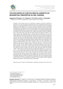 It is advisable to refer to the publisher's version if you intend to cite from this work. See Guidance on citing. Official URL: https://waberconference.com/upcoming-conference/ Abstract/SummaryChanges in rental values may occur in response to changes in economic conditions at all levels of an economy. Against the backdrop of recent unstable GDP growth rates in Nigeria, this study evaluated the influence of GDP on rental growth rates of residential properties in Ede, Nigeria with a view to providing information that will aid better understanding of the dynamics of residential property market for investment decisions. It analyzed the magnitude of growth in rental values of five residential property types comprising tenement room, one room self-contained, room and parlour self-contained, two bedroom flat and three bedroom flat to determine whether significant difference exist in the growth rates across the five property types; the extent of variation in the rental values of the properties types in Ede caused by GDP growth; and also, the relationship between GDP growth rates and rental growth rates of residential properties in the study area. The study utilized both primary and secondary data. Primary data used for the study was collected through structured questionnaire administered on landlords who rented their properties within the study period and comprised rental values of five residential property types between 2002 and 2017. Secondary data for the study comprised Nigeria’s GDP figures between 2002 and 2017. Descriptive and inferential statistical techniques such as frequency table, chart, ANOVA and linear regression were used to analyse the data. The results revealed a mean yearly growth rates of 17.03%, 17.01%, 16.57%, 19.86% and 20.83% for tenement room, one room self-contained, room and parlour self-contained, two bedroom flat and three bedroom flat respectively; and the mean rental growth rates across the selected residential property types at 95% confidence level are not significantly different F (4, 70) = 0.345 P = .847 > .05. Furthermore, during the period under study, GDP values were found to have a strong positive relationship with rental values of residential properties in the study area and accounts for about 73%, 75%, 82%, 76% and 83% of variation in rental values of tenement room, one room self-contained, room and parlour self-contained, two bedroom flat and three bedroom flat respectively. The study however found no statistically significant relationship between GDP growth rates and rental growth rates of residential properties in the study area. Consequently, the study concluded that GDP growth rates do not have significant influence on rental growth rates of selected residential properties in Ede during period understudied.