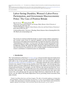 It is advisable to refer to the publisher's version if you intend to cite from this work. See Guidance on citing. To link to this item DOI: 10.1093/ereh/heaf017 Abstract/SummaryThe postwar era witnessed substantial changes in women’s formal workforce participation and economic status, driven by equal pay legislation and labor-saving durables that removed most of the fatigue from household tasks. To explore the importance of the postwar “industrialization of the home,” we focus on the UK, where successive governments both restricted the diffusion of labor-saving durables and blocked equal pay legislation, as part of deflationary strategy. We explore the negative impacts of these policies and show that when the restrictions were relaxed in the 1970s, consumer durables ownership and married women’s contributions to household incomes rose substantially.