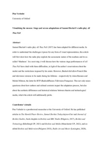 It is advisable to refer to the publisher's version if you intend to cite from this work. See Guidance on citing. To link to this item DOI: 10.1386/jafp_00117_1 Abstract/SummarySamuel Beckett’s radio play 'All That Fall' (1957) has been adapted for different media. In order to understand the challenges it poses for any form of visual representation, this article will first show how the radio play exploits the acousmatic nature of the medium and its so-called blindness. In a next step, it will discuss how stage performances of 'All That Fall' have dealt with these difficulties, in light of Beckett's reservations on the matter and the restrictions imposed by his estate. He did allow French film and TV versions to be made during his lifetime – respectively by Alain Resnais and Michel Mitrani, the latter for RTF (Radiodiffusion-Télévision Française). This not only raises questions about how authors and cultural contexts impact the adaptation process, but also about the aesthetic differences and historical relations between theatre and technological media, which the article will additionally probe.