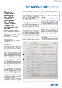It is advisable to refer to the publisher's version if you intend to cite from this work. See Guidance on citing. To link to this item DOI: 10.1002/wea.7775 Abstract/SummaryOver the past three centuries, thousands of people across the British and Irish Isles have regularly recorded rainfall, often every day for decades. Their efforts allow us to reconstruct long‐term trends and variations in rainfall with high spatial detail for the whole of the UK since 1836, and longer for certain regions. Here we recognise some of the individuals who made particularly important contributions in the earliest years of organised rainfall monitoring.