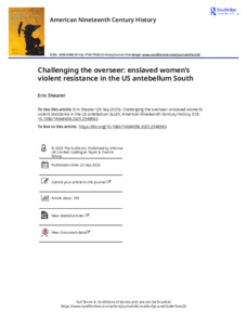 It is advisable to refer to the publisher's version if you intend to cite from this work. See Guidance on citing. To link to this item DOI: 10.1080/14664658.2025.2548983 Abstract/SummaryThis article examines violent confrontations between enslaved women and white overseeing men, exploring how enslaved women opposed overseers through the weaponization of objects and fixtures on sites of enslavement across the antebellum South. Few studies have explored enslaved women’s weaponized resistance and how they shaped the landscape of the US slaveholding South for their own violent purposes. Guided by judicial records, fugitive narratives, and the testimony of the formerly enslaved, the cases included in this study illuminate how enslaved women radically re-interpreted violence for their own use, highlighting the complexity of their actions in slavery to include physical acts which occurred within and beyond the remit of self-protection. In creating a counter-conceptualization of armed violence, “Challenging the Overseer” considers the possibilities for, and uses of, enslaved women’s armed resistance against male overseers and underscores that female militance existed alongside the armed resistance of enslaved men, as more commonly portrayed in abolitionist materials. This examination aims to create a broader conceptualization of violence, one that diverges from the established focus on violence against women to open new discussions surrounding enslaved women’s own agentic use of physical force.