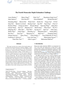 It is advisable to refer to the publisher's version if you intend to cite from this work. See Guidance on citing. Abstract/SummaryThis paper presents the results of the fourth edition of the Monocular Depth Estimation Challenge (MDEC), which focuses on zero-shot generalization to the SYNS-Patches benchmark, a dataset featuring challenging environments in both natural and indoor settings. In this edition, we revised the evaluation protocol to use least-squares alignment with two degrees of freedom to support disparity and affineinvariant predictions. We also revised the baselines and included popular off-the-shelf methods: Depth Anything v2 and Marigold. The challenge received a total of 24 submissions that outperformed the baselines on the test set; 10 of these included a report describing their approach, with most leading methods relying on affine-invariant predictions. The challenge winners improved the 3D F-Score over the previous edition’s best result, raising it from 22.58% to 23.05%.
