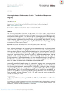 It is advisable to refer to the publisher's version if you intend to cite from this work. See Guidance on citing. To link to this item DOI: 10.1017/pub.2025.10074 Abstract/SummaryThe drive for greater public engagement and the turn to social science: each is an important and welcome movement in contemporary political philosophy. However, the relationship between these two boundary-crossing endeavours is not simple or obvious. I suggest that political philosophers have sometimes been too quick to assume that empirically-sensitivity and publicness go together; and I identify some ways in which these features can diverge and even compete. More positively, I go on to outline a modestly public role for political philosophy that is facilitated by in-depth engagement with diverse forms of social scientific evidence.