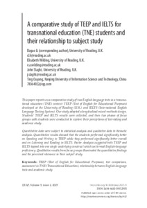 It is advisable to refer to the publisher's version if you intend to cite from this work. See Guidance on citing. To link to this item DOI: 10.3828/ijeap.2025.11 Abstract/SummaryThis paper reports on a comparative study of two English language tests in a transnational education (TNE) context: TEEP (Test of English for Educational Purposes) developed at the University of Reading (U.K.) and IELTS (International English Language Testing System). Our study adopted a longitudinal mixed-methods design. Students’ TEEP and IELTS results were collected, and then two phases of focus groups with students were conducted to explore their perceptions of test-taking and academic study. Quantitative data were subject to statistical analysis and qualitative data to thematic analysis. Quantitative results showed that the students performed significantly better on Speaking and Writing in TEEP while they performed significantly better overall and on Listening and Reading in IELTS. Factor Analysis suggested both TEEP and IELTS tapped into one single underlying construct which we termed English-language proficiency. Qualitative results from focus groups illuminated the quantitative findings and the perceived relevance in their subject study.