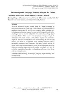 It is advisable to refer to the publisher's version if you intend to cite from this work. See Guidance on citing. To link to this item DOI: 10.4995/head21.2021.13001 Abstract/SummaryThere has been much written recently round the “digital revolution” of universities (Nascimento Cunha et al., 2020). Indeed, in 2020 the COVID-19 pandemic demonstrated the need for universities to adapt and adopt new technological tools for teaching and learning, as both the global world we live in changed, and as students adapted to the continually evolving digital landscape. The BA Online is a new interdisciplinary online presence for the humanities and social sciences, and includes a focus on constructive alignment, innovative learning objects, and social learning. The semester-long courses were built as a supported social learning experience that is purposefully constructed with a narrative. This article reveals how the BA Online project was realised through the use of partnerships, particularly that of the university learning designers who worked very closely with both the online learning platform FutureLearn and academic staff in curriculum design and course transformation.
