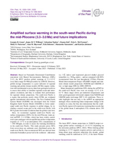 It is advisable to refer to the publisher's version if you intend to cite from this work. See Guidance on citing. To link to this item DOI: 10.5194/cp-19-1359-2023 Abstract/SummaryBased on Nationally Determined Contributions concurrent with Shared Socioeconomic Pathways (SSPs) 2-4.5, the IPCC predicts global warming of 2.1–3.5 ∘C (very likely range 10–90th percentile) by 2100 CE. However, global average temperature is a poor indicator of regional warming and global climate models (GCMs) require validation with instrumental or proxy data from geological archives to assess their ability to simulate regional ocean and atmospheric circulation, and thus, to evaluate their performance for regional climate projections. The south-west Pacific is a region that performs poorly when GCMs are evaluated against instrumental observations. The New Zealand Earth System Model (NZESM) was developed from the United Kingdom Earth System Model (UKESM) to better understand south-west Pacific response to global change, by including a nested ocean grid in the south-west Pacific with 80 % greater horizontal resolution than the global-scale host. Here, we reconstruct regional south-west Pacific sea-surface temperatures (SSTs) for the mid-Pliocene warm period (mPWP; 3.3–3.0 Ma), which has been widely considered a past analogue with an equilibrium surface temperature response of +3 ∘C to an atmospheric CO2 concentration of ∼350–400 ppm, in order to assess the warming distribution in the south-west Pacific. This study presents proxy SSTs from seven deep sea sediment cores distributed across the south-west Pacific. Our reconstructed SSTs are derived from molecular biomarkers preserved in the sediment – alkenones (i.e. Uk'37 index) and isoprenoid glycerol dialkyl glycerol tetraethers (i.e. TEX86 index) – and are compared with SSTs reconstructed from the Last Interglacial (125 ka), Pliocene Model Intercomparison Project (PlioMIP) outputs and transient climate model projections (NZESM and UKESM) of low- to high-range SSPs for 2090–2099 CE. Mean interglacial equilibrium SSTs during the mPWP for the south-west Pacific sites were on average 4.2 ∘C (1.8–6.1 ∘C likely range) above pre-industrial temperatures and show good agreement with model outputs from NZESM and UKESM under mid-range SSP 2–4.6 conditions. These results highlight that not only is the mPWP an appropriate analogue when considering future temperature change in the centuries to come, but they also demonstrate that the south-west Pacific region will experience warming that exceeds that of the global mean if atmospheric CO2 remains above 350 ppm.