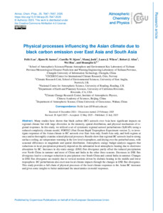 It is advisable to refer to the publisher's version if you intend to cite from this work. See Guidance on citing. To link to this item DOI: 10.5194/acp-25-7647-2025 Abstract/SummaryMany studies have shown that black carbon (BC) aerosols over Asia have significant impacts on regional climate but with large diversities in the intensity, spatial distribution, and physical mechanism of regional responses. In this study, we utilized a set of systematic regional aerosol perturbations (SyRAPs) using a reduced-complexity climate model, FORTE2 (Fast Ocean Rapid Troposphere Experiment version 2), to investigate responses of the Asian climate to BC aerosols over East Asia only, South Asia only, and both regions at once and to thoroughly examine related physical processes. Results show that regional BC aerosols lead to strong surface cooling, air temperature warming in the low-level troposphere, and drying over the perturbed areas, with seasonal differences in magnitude and spatial distribution. Atmospheric energy budget analysis suggests that reductions in local precipitation primarily depend on the substantial local atmospheric heating due to shortwave absorption by BC. Increases in dry-static-energy (DSE) flux divergence partly offset the reduced precipitation over North China in summer and most of China and India in the other three seasons. Decreases in DSE flux divergence lead to a stronger reduction in precipitation over South China and central India in summer. Changes in DSE flux divergence are mainly due to vertical motions driven by diabatic heating in the middle and lower troposphere. BC perturbations also exert non-local climate impacts through the changes in DSE flux divergence. This study provides a full chain of physical processes of the local climate responses to the Asian BC increases and gives some insights to better understand the uncertainties in model responses.