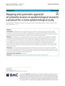 It is advisable to refer to the publisher's version if you intend to cite from this work. See Guidance on citing. To link to this item DOI: 10.1186/s13643-023-02265-7 Abstract/SummaryIntroduction: Umbrella review is one of the terms used to describe an overview of systematic reviews. During the last years, a rapid increase in the number of umbrella reviews on epidemiological studies has been observed, but there is no systematic assessment of their methodological and reporting characteristics. Our study aims to fill this gap by performing a systematic mapping of umbrella reviews in epidemiological research. Methods: We will perform a meta-epidemiological study including a systematic review in MEDLINE and EMBASE to identify all the umbrella reviews that focused on systematic reviews of epidemiological studies and were published from inception until December 31, 2022. We will consider eligible any research article which was designed as an umbrella review and summarized systematic reviews and meta-analyses of epidemiological studies. From each eligible article, we will extract information about the research topic, the methodological characteristics, and the reporting characteristics. We will examine whether the umbrella reviews assessed the strength of the available evidence and the rigor of the included systematic reviews. We will also examine whether these characteristics change across time. Discussion: Our study will systematically appraise the methodological and reporting characteristics of published umbrella reviews in epidemiological literature. The findings of our study can be used to improve the design and conduct of future umbrella reviews, to derive a standardized set of reporting and methodological guidelines for umbrella reviews, and to allow further meta-epidemiological work.