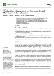 It is advisable to refer to the publisher's version if you intend to cite from this work. See Guidance on citing. To link to this item DOI: 10.3390/rs17193329 Abstract/SummaryCloud and snow often share comparable visual and structural patterns in satellite observations, making their accurate discrimination and segmentation particularly challenging. To overcome this, we design an innovative Transformer-guided architecture with complementary feature-extraction capabilities. The encoder adopts a dual-path structure, integrating a Transformer Encoder Module (TEM) for capturing long-range semantic dependencies and a ResNet18-based convolutional branch for detailed spatial representation. A Feature-Enhancement Module (FEM) is introduced to promote bidirectional interaction and adaptive feature integration between the two pathways. To improve delineation of object boundaries, especially in visually complex areas, we embed a Deep Feature-Extraction Module (DFEM) at the deepest layer of the convolutional stream. This component refines channel-level information to highlight critical features and enhance edge clarity. Additionally, to address noise from intricate backgrounds and ambiguous cloud-snow transitions, we incorporate both a Transformer Fusion Module (TFM) and a Strip Pooling Auxiliary Module (SPAM) in the decoding phase. These modules collaboratively enhance structural recovery and improve robustness in segmentation. Extensive experiments on the CSWV and SPARCS datasets show that our method consistently outperforms state-of-the-art baselines, demonstrating its strong effectiveness and applicability in real-world cloud and snow-detection scenarios.