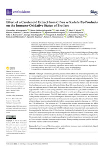 It is advisable to refer to the publisher's version if you intend to cite from this work. See Guidance on citing. To link to this item DOI: 10.3390/antiox11010144 Abstract/SummaryAlthough carotenoids generally possess antimicrobial and antioxidant properties, the in vivo synergistic action of carotenoid blends derived from plant-based by-products has not been thoroughly studied. Therefore, the carotenoid characterization and antimicrobial potential of Citrus reticulata extract as well as the impact of this carotenoid-rich extract (CCE) dietary supplementation on the performance, meat quality, and immune-oxidative status of broiler chickens were determined. One hundred and twenty one-day-old hatched chicks (Ross 308) were allocated to two dietary groups, with four replicate pens of 15 birds each. Birds were fed either a basal diet (CON) or the basal diet supplemented with 0.1% CCE (25 mg carotenoid extract included in 1 g of soluble starch) for 42 d. β-Cryptoxanthin, β-Carotene, Zeaxanthin, and Lutein were the prevailing carotenoid compounds in the Citrus reticulata extract. The CCE feed additive exerted inhibitory properties against both Gram-positive (Staphylococcus aureus) and negative (Klebsiella oxytoca, Escherichia coli, and Salmonella typhimurium) bacteria. Both the broiler performance and meat quality did not substantially differ, while the breast muscle malondialdehyde (MDA) concentration tended to decrease (p = 0.070) in the CCE-fed broilers. The inclusion of CCE decreased the alanine aminotransferase and MDA concentration, and the activity of glutathione peroxidase, while the activity of superoxide dismutase was increased in the blood. Catalase and NADPH oxidase 2 relative transcript levels were significantly downregulated in the livers of the CCE-fed broilers. Additionally, Interleukin 1β and tumor necrosis factor (TNF) relative transcript levels were downregulated in the livers of the CCE- fed broilers, while TNF and interferon γ (IFNG) tended to decrease in the spleens and bursa of Fabricius, respectively. The present study provided new insights regarding the beneficial properties of carotenoids contained in Citrus reticulata in broilers’ immune-oxidative status. These promising outcomes could be the basis for further research under field conditions.