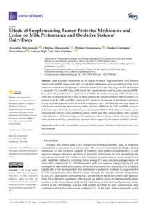 It is advisable to refer to the publisher's version if you intend to cite from this work. See Guidance on citing. To link to this item DOI: 10.3390/antiox10050654 Abstract/SummaryThere is limited information on the impact of dietary supplementation with separate rumen-protected (RP) amino acids (AA), or with their combination, on ewes’ oxidative status. Sixty ewes were divided into five groups; C: basal diet (control); M: basal diet + 6 g/ewe RP methionine; L: basal diet + 5 g/ewe RP lysine; LML: basal diet + 6 g methionine and 5 g lysine/ewe; and HML: basal diet + 12 g methionine + 5 g lysine/ewe. Milk’s fat content increased in RP-AA fed ewes, while that of protein in M and L only. In blood plasma, the malondialdehyde (MDA) content was reduced in the M, LML, and HML compared to C-fed ewes. An increase in glutathione transferase activity in the blood plasma of the M and LML compared to the C and HML-fed ewes were found. In milk, lower values of the ferric reducing ability of plasma (FRAP) in the LML and HML-fed ewes and of 2,2′-Azino-bis 3-ethylbenzthiazoline-6-sulfonic acid (ABTS) in LML only, were found. Lysine increased milk’s FRAP values and MDA content. Both L and HML diets increased milk’s protein carbonyls content. Methionine improves the organism’s oxidative status, without adversely affecting milk’s oxidative stability. Lysine dietary inclusion affects negatively the oxidative stability of milk.