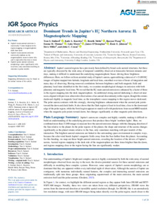 It is advisable to refer to the publisher's version if you intend to cite from this work. See Guidance on citing. To link to this item DOI: 10.1029/2025ja034076 Abstract/SummaryJupiter's auroral regions have previously been defined by broad‐scale auroral structures, but these are typically obscured by the wide array of temporal variability observed at timescales between minutes and days, making it difficult to understand the underlying magnetospheric biases driving these brightness differences. Here, we follow on from an initial study of Jupiter's aurora, again utilizing a data set of 13,000 images of Jupiter mapped into latitude, longitude and local time, smoothed over tens of hours of integration and many days of observing. Having removed correlations between brightness and both magnetic field and planetary local time identified in the first study, we examine morphological changes in emission with both planetary and magnetic local time. We reveal that the main auroral emission is enhanced by a factor of three in the region mapping into the dusk magnetosphere. An additional strong auroral darkening is observed near noon, aligned with previous ultraviolet observations of an auroral discontinuity in this region, though this rotates duskward slightly in magnetic local time, as the ionospheric source mapping to this region moves duskward. The polar aurora contrasts with this strongly, showing brightness enhancement when the auroral pole points toward the dawn and dusk limbs. It also shows that the Dark region is fixed in local time, close to the dawnward edge of the polar region, while the Swirl region appears to match well with predictions from recent MHD models when the magnetic pole points toward dawn, but changes significantly at other magnetic pole directions.