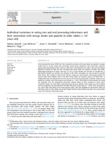 Individual variations in eating rate and oral processing behaviours and their association with energy intake and appetite in older adults (≥ 65 years old)Zannidi, D., Methven, L., Woodside, J. V., McKenna, G., Forde, C. G. and Clegg, M. E. (2025) Individual variations in eating rate and oral processing behaviours and their association with energy intake and appetite in older adults (≥ 65 years old). Appetite, 208. 107917. ISSN 1095-8304