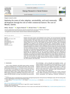 It is advisable to refer to the publisher's version if you intend to cite from this work. See Guidance on citing. To link to this item DOI: 10.1016/j.erss.2025.104336 Abstract/SummaryPersistent rural energy poverty, weak institutional service delivery, and socio-environmental vulnerability continue to constrain equitable development in many rural settings. While decentralised solar technologies offer promising alternatives, their uptake remains uneven and poorly understood, particularly regarding the role of unconventional actors such as white commercial farmers (WCFs). This study addresses a critical research gap by exploring whether, and in what ways, WCFs facilitate solar photovoltaic (PV) adoption, foster environmental sustainability, and contribute to rural community development. Using a multi-sited qualitative case study in Mkushi and surrounding rural districts, the study engaged 16 in-depth semi-structured interviews with WCFs, 1 focus group discussion and 3 interviews with key stakeholders from the energy sector and government policy institutions. Findings reveal that WCFs are not passive economic agents but actively engage in energy transitions and socio-environmental governance. Their contributions span community infrastructure provision, informal solar finance, and conservation-oriented agricultural practices. WCFs also act as intermediaries between local communities and external actors, although their efforts are often constrained by affordability barriers, policy fragmentation, and institutional inertia. The study recommends strengthening cross-sector collaboration to integrate WCFs into national solar strategies, incentivising off-grid systems through land and infrastructure partnerships, and securing solar investments through community-driven security solutions. Furthermore, environmental stewardship programmes should be scaled and linked to energy policy through participatory frameworks. This research provides new insights into the intersecting domains of decentralised energy, agrarian development, and environmental transitions, offering practical and theoretical contributions to more inclusive and context-responsive rural energy policy.
