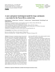 It is advisable to refer to the publisher's version if you intend to cite from this work. See Guidance on citing. To link to this item DOI: 10.5194/hess-27-453-2023 Abstract/SummaryIn this paper we implement a degree day snowmelt and glacier melt model in the Dynamic fluxEs and ConnectIvity for Predictions of HydRology (DECIPHeR) model. The purpose is to develop a hydrological model that can be applied to large glaciated and snow-fed catchments yet is computationally efficient enough to include model uncertainty in streamflow predictions. The model is evaluated by simulating monthly discharge at six gauging stations in the Naryn River catchment (57 833 km2 ) in central Asia over the period 1951 to a variable end date between 1980 and 1995 depending on the availability of discharge observations. The spatial distribution of simulated snow cover is validated against MODIS weekly snow extent for the years 2001–2007. Discharge is calibrated by selecting parameter sets using Latin hypercube sampling and assessing the model performance using six evaluation metrics. The model shows good performance in simulating monthly discharge for the calibration period (NSE is 0.74 < NSE < 0.87) and validation period (0.7 < NSE < 0.9), where the range of NSE values represents the 5th– 95th percentile prediction limits across the gauging stations. The exception is the Uch-Kurgan station, which exhibits a reduction in model performance during the validation period attributed to commissioning of the Toktogul reservoir in 1975 which impacted the observations. The model reproduces the spatial extent in seasonal snow cover well when evaluated against MODIS snow extent; 86 % of the snow extent is captured (mean 2001–2007) for the median ensemble member of the best 0.5 % calibration simulations. We establish the present-day contributions of glacier melt, snowmelt and rainfall to the total annual runoff and the timing of when these components dominate river flow. The model predicts well the observed increase in discharge during the spring (April–May) associated with the onset of snow melting and peak discharge during the summer (June, July and August) associated with glacier melting. Snow melting is the largest component of the annual runoff (89 %), followed by the rainfall (9 %) and the glacier melt component (2 %), where the values refer to the 50th percentile estimates at the catchment outlet gauging station Uch-Kurgan. In August, glacier melting can contribute up to 66 % of the total runoff at the highly glacierized Naryn headwater sub-catchment. The glaciated area predicted by the best 0.5 % calibration simulations overlaps the Landsat observations for the late 1990s and mid-2000s. Despite good predictions for discharge, the model produces a large range of estimates for the glaciated area (680–1196 km2 ) (5th–95th percentile limits) at the end of the simulation period. To constrain these estimates further, additional observations such as glacier mass balance, snow depth or snow extent should be used directly to constrain model simulations.