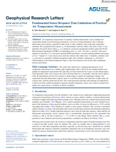 It is advisable to refer to the publisher's version if you intend to cite from this work. See Guidance on citing. To link to this item DOI: 10.1029/2025GL118464 Abstract/SummaryAir temperature measurements in naturally ventilated thermometer screens underpin the instrumental climate record. Increasing automation is, however, revealing limitations. One is through thermometer time response, especially in light winds or calm conditions, often at the daily temperature minimum. The exponential time response τ_63 for thermometers enclosed within a Stevenson screen is a key parameter, but poorly known. Here, τ_63 is evaluated in a practical experimental situation against the World Meteorological Organization (WMO)’s recommended sensor τ_63≤20 s. We find τ_63 increases with sensor diameter d, with only a d=2 mm sensor meeting WMO expectations, even then requiring ambient wind speeds ≥3 ms^(-1). Typical d=4 mm sensors never meet the criterion when either force- or naturally ventilated, with τ_63≥20 mins in a naturally ventilated arrangement under calm conditions. Inadequate τ_63 will lead to underestimation of the diurnal temperature range or other local changes derived from daily temperature maxima and minima.