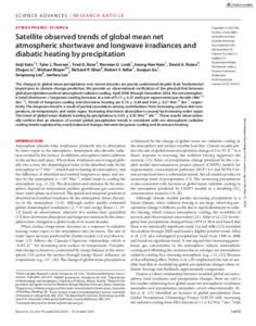 It is advisable to refer to the publisher's version if you intend to cite from this work. See Guidance on citing. To link to this item DOI: 10.1126/sciadv.adz1292 Abstract/SummaryThe changes in global mean precipitation over recent decades are poorly understood despite their fundamental importance to climate change prediction. We provide an observational verification of the physical link between global precipitation and net atmospheric radiative cooling. April 2006 through December 2024, the net atmospheric total (shortwave + longwave) cooling increases at a rate of 0.11 ± 0.31 watts per square meter per decade (Wm−2 dec−1). Trends of longwave cooling and shortwave heating are 0.76 ± 0.48 and 0.64 ± 0.27 Wm−2 dec-1, respectively. The longwave trend is a result of partial cancelation among contributions from increasing surface skin temperature, air temperature, and water vapor. Increasing shortwave absorption is caused by increasing water vapor. The trend of global mean diabatic heating by precipitation is 0.03 ± 0.61 Wm−2 dec−1. These results observationally confirm that an absence of current global precipitation trends is consistent with net atmospheric radiative cooling trends explained by nearly balanced changes between longwave cooling and shortwave heating.