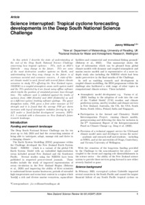It is advisable to refer to the publisher's version if you intend to cite from this work. See Guidance on citing. To link to this item DOI: 10.26686/nzsr.v80.9543 Abstract/SummaryIn this article I describe the state of understanding at the end of the Deep South National Science Challenge concerning how tropical cyclones – TCs, such as 2023’s Gabrielle – may change in the future. TCs are some of the most destructive weather systems on Earth, and understanding how they may change in the future is of enormous societal and economic concern. A state-of-theart climate model is used, forced with several future climate scenarios to study TCs affecting the New Zealand region. UKESM1 is a coupled atmosphere-ocean earth system model and the TCs predicted by it are found using offline software which tracks the position of simulated pressure lows through time. The software used is validated against the tracks of cyclones from 1968 [Giselle] and 2023 [Gabrielle] as well as a different cyclone tracking software package. The power dissipation index, PDI, gives a first order measure of TC strength and it is found that the average PDI per storm increases with top-of atmosphere radiative forcing by up to 24% under a ‘fossil-fuelled development’ scenario, SSP5- 8.5. I conclude with a discussion on New Zealand’s future research landscape.