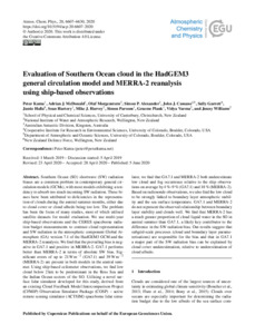Kuma, P., McDonald, A. J., Morgenstern, O., Alexander, S. P., Cassano, J. J., Garrett, S., Halla, J., Hartery, S., Harvey, M. J., Parsons, S., Plank, G., Varma, V. and Williams, J. ORCID: https://orcid.org/0000-0002-0680-0098 (2020) Evaluation of Southern Ocean cloud in the HadGEM3 general circulation model and MERRA-2 reanalysis using ship-based observations. Atmospheric Chemistry and Physics, 20 (11). pp. 6607-6630. ISSN 1680-7324 doi: 10.5194/acp-20-6607-2020