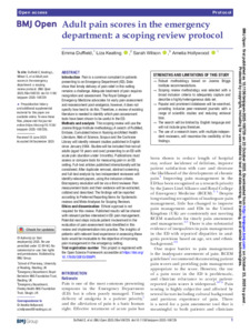 It is advisable to refer to the publisher's version if you intend to cite from this work. See Guidance on citing. To link to this item DOI: 10.1136/bmjopen-2025-106729 Abstract/SummaryIntroduction Pain is a common complaint in patients presenting to an Emergency Department (ED). Data show that timely delivery of pain relief in this setting remains a challenge. Adequate treatment of pain requires recognition and assessment. The Royal College of Emergency Medicine advocates for early pain assessment and reassessment post-analgesia; however, it does not specify how best to do this. Therefore, a review of existing literature is needed to identify which pain assessment tools have been shown to be useful in the ED. Methods and analysis This scoping review will use the Joanna Briggs Institute methodology. A search of PubMed, Embase, Cumulated Index in Nursing and Allied Health Literature, Web of Science, Scopus and the Cochrane Library will identify relevant studies published in English since January 2004. Studies will be included that recruit adults (aged 18 years and over) presenting to an ED with acute pain (duration under 3 months). Publications must assess or compare tools for measuring pain in an ED setting. Full-text articles published internationally will be considered. After duplicate removal, abstract screening and full-text analysis by two independent reviewers will identify relevant papers, using the inclusion criteria. Discrepancy resolution will be via a third reviewer. Pain measurement tools and their evidence will be extracted, collated and described. The findings will be reported according to Preferred Reporting Items for Systematic reviews and Meta-Analyses for Scoping Reviews. Ethics and dissemination Ethical approval is not required for this review. Published results will be shared with relevant parties interested in ED pain management. Potential next steps include patient involvement in the evaluation of pain assessment tools identified in this review and implementation into practice. The insights of patients with relevant lived experience in assessing these tools would be invaluable to the objective of improving pain management in the emergency setting. Trial registration number This project is registered with the Open Science Framework accessible at https://doi.org/10.17605/OSF.IO/ENVPY.