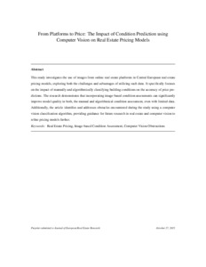 It is advisable to refer to the publisher's version if you intend to cite from this work. See Guidance on citing. To link to this item DOI: 10.1108/JERER-03-2024-0013 Abstract/SummaryPurpose The aim is to investigate the impact of building condition classifications derived from images on the accuracy of real estate pricing models. It explores whether manual and computer vision-based classifications of three property condition classes can enhance the predictive accuracy of a basic hedonic pricing model for real estate valuation. Additionally, the study sheds light on potential challenges encountered in applying computer vision to real estate valuation. Design/methodology/approach This study explores the influence of building condition classes, derived from images, on a basic real estate hedonic pricing model, using data from online brokerage platforms. The three condition classes are based on a standardized classification and assessed by real estate experts. To examine the potential of computer vision in automating property assessment, the study employs convolutional neural networks (CNNs) to replicate expert condition classifications within the pricing model. Findings The findings of this study indicate that human-based classifications significantly improve the model, while CNNs also enhance accuracy but less effectively. The model’s predictive accuracy decreases when excluding the construction year in CNN-based assessments. CNNs show promise in automating property evaluations with around 60% accuracy for the three predicted classes. Research limitations/implications The research faces limitations due to the subjective nature of manually classifying property conditions and the variability in image quality across real estate platforms. It also notes the challenge of standardizing the use of images for valuation purposes, specifically condition assessment, given the diverse presentation styles. Practical implications It indicates that a shift toward more objective and standardized image assessments could improve the reliability of valuations. This advancement offers practical benefits for real estate professionals and platforms by streamlining appraisal processes and reducing costs. Originality/value Its originality lies in the application of computer vision using real-word data and non-standardized images to automate property evaluations. The value of the research demonstrates the potential for enhancing pricing model accuracy through visual data analysis using data from online brokerage platforms.