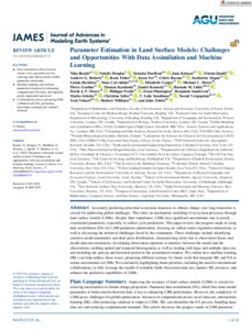 It is advisable to refer to the publisher's version if you intend to cite from this work. See Guidance on citing. To link to this item DOI: 10.1029/2024MS004733 Abstract/SummaryAccurately predicting terrestrial ecosystem responses to climate change over long-timescales is crucial for addressing global challenges. This relies on mechanistic modeling of ecosystem processes through land surface models (LSMs). Despite their importance, LSMs face significant uncertainties due to poorly constrained parameters, especially in carbon cycle predictions. This paper reviews the progress made in using data assimilation (DA) for LSM parameter optimization, focusing on carbon-water-vegetation interactions, as well as discussing the technical challenges faced by the community. These challenges include identifying sensitive model parameters and their prior distributions, characterizing errors due to observation biases and model-data inconsistencies, developing observation operators to interface between the model and the observations, tackling spatial and temporal heterogeneity as well as dealing with large and multiple data sets, and including the spin-up and historical period in the assimilation window. We outline how machine learning (ML) can help address these issues, proposing different avenues for future work that integrate ML and DA to reduce uncertainties in LSMs. We conclude by highlighting future priorities, including the need for international collaborations, to fully leverage the wealth of available Earth observation data sets, harness ML advances, and enhance the predictive capabilities of LSMs.