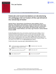It is advisable to refer to the publisher's version if you intend to cite from this work. See Guidance on citing. To link to this item DOI: 10.1080/03069400.2022.2140512 Abstract/SummaryThis report outlines the rationale behind and recommendations on the steps that need to be taken towards decolonising the Law School's pedagogy and curriculum. It concludes a two-year process of research and discussions involving a joint effort between staff and students. A rationale for a change in approach to both pedagogy and curriculum is presented together with recommendations and practical examples of how this might be achieved in modular teaching in the Law School.