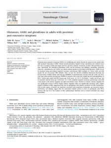 Joyce, J. M., Mercier, L. J., Stokoe, M., La, P. L., Bell, T., Batycky, J. M., Debert, C. T. and Harris, A. D. (2022) Glutamate, GABA and glutathione in adults with persistent post-concussive symptoms. NeuroImage: Clinical, 36. 103152. ISSN 22131582 doi: :10.1016/j.nicl.2022.103152