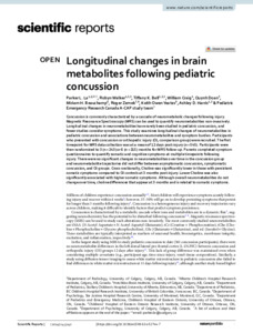 Longitudinal changes in brain metabolites following pediatric concussionLa, P. L. L., Walker, R., Bell, T. K., Craig, W., Doan, Q., Beauchamp, M. H., Zemek, R., Yeates, K. O., Harris, A. D., Yeates, K. O., Beauchamp, M. H., Bjornson, B. H., Gravel, J., Mikrogianakis, A., Goodyear, B., Abdeen, N., Beaulieu, C., Dehaes, M., Deschenes, S., Harris, A. D. et al (2024) Longitudinal changes in brain metabolites following pediatric concussion. Scientific Reports, 14. 3242. ISSN 2045-2322