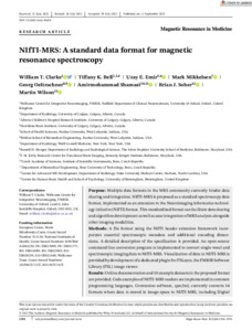 It is advisable to refer to the publisher's version if you intend to cite from this work. See Guidance on citing. To link to this item DOI: 10.1002/mrm.29418 Abstract/SummaryPurpose: Multiple data formats in the MRS community currently hinder data sharing and integration. NIfTI-MRS is proposed as a standard spectroscopy data format, implemented as an extension to the Neuroimaging informatics technology initiative (NIfTI) format. This standardized format can facilitate data sharing and algorithm development as well as ease integration of MRS analysis alongside other imaging modalities. Methods: A file format using the NIfTI header extension framework incorporates essential spectroscopic metadata and additional encoding dimensions. A detailed description of the specification is provided. An open-source command-line conversion program is implemented to convert single-voxel and spectroscopic imaging data to NIfTI-MRS. Visualization of data in NIfTI-MRS is provided by development of a dedicated plugin for FSLeyes, the FMRIB Software Library (FSL) image viewer. Results: Online documentation and 10 example datasets in the proposed format are provided. Code examples of NIfTI-MRS readers are implemented in common programming languages. Conversion software, spec2nii, currently converts 14 formats where data is stored in image-space to NIfTI-MRS, including Digital Imaging and Communications in Medicine (DICOM) and vendor proprietary formats. Conclusion: NIfTI-MRS aims to solve issues arising from multiple data formats being used in the MRS community. Through a single conversion point, processing and analysis of MRS data are simplified, thereby lowering the barrier to use of MRS. Furthermore, it can serve as the basis for open data sharing, collaboration, and interoperability of analysis programs. Greater standardization and harmonization become possible. By aligning with the dominant format in neuroimaging, NIfTI-MRS enables the use of mature tools present in the imaging community, demonstrated in this work by using a dedicated imaging tool, FSLeyes, for visualization.