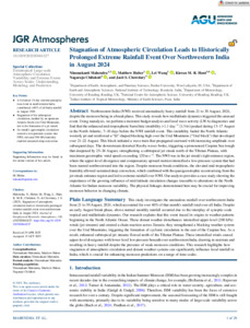 It is advisable to refer to the publisher's version if you intend to cite from this work. See Guidance on citing. To link to this item DOI: 10.1029/2025JD044227 Abstract/SummaryNorthwestern India (NWI) received anomalously heavy rainfall from 21 to 30 August, 2024, despite the monsoon being in a break phase. This study reveals how midlatitude dynamics triggered this unusual event. Using reanalysis, we perform a moisture budget analysis and local wave activity (LWA) diagnostics and find that the enhanced mid-tropospheric baroclinic instability >1.1 day^-1 (1.34σ) peaked during 13–17 August in the North Atlantic, 7–10 days before the NWI rainfall event. This instability fueled the North Atlantic westerly jet and reinforced a “Ω” shaped blocking high over the Ural Mountains (“Ural block”) that developed over 21–22 August. This block initiated a wave train that propagated eastward with increasing amplitude over subsequent days. The downstream distorted Rossby waves broke, triggering a pronounced Caspian Sea trough that deepened by 25–26 August, strengthening a subtropical jet streak north of the Tibetan Plateau, with maximum geostrophic wind speeds exceeding 120 . The NWI was in the jet streak's right entrance region, where the upper-level divergence and compensatory upward motion intensified a low-pressure system that had been steered northwestward into the region. Despite monsoon break conditions, the elevated mid-tropospheric humidity allowed sustained deep convection, which combined with the quasigeostrophic ascent arising from the jet streak entrance region and led to extreme rainfall over NWI. Our analysis provides a case study showing the importance of the growing influence of mid-latitude circulation changes traceable to alterations in the North Atlantic for Indian monsoon variability. The physical linkages demonstrated here may be crucial for improving monsoon behavior in changing climate.