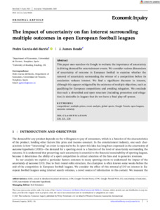 It is advisable to refer to the publisher's version if you intend to cite from this work. See Guidance on citing. To link to this item DOI: 10.1111/ecin.70024 Abstract/SummaryThis paper uses searches via Google to evaluate the importance of uncertainty in driving demand for entertainment events. We consider various dimensions of uncertainty of outcome in European football to examine whether the removal of uncertainty surrounding the winner of a competition before its conclusion reduces interest. We find a significant decrease in interest, although this appears mitigated by the existence of multiple objectives, such as qualifying for European competitions and avoiding relegation. We conclude that such a diversified and open structure (including promotion and relegation) is desirable in leagues that do not have a final play-off system.