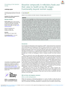 This review aims to highlight some of the key bioactivefunctionalities that a range of components in milk can potentiallymake to reduce risks to health at key life stages. Suchfunctionalities cannot be adequately explained by traditional estimates of nutrient supply. The benefits of gangliosides from the milk fat globule membrane (MFGM) for neonatal neurodevelopment are examined along with milk proteins for growth stimulation of children via the proteins’ ability to stimulate insulin-like growthfactor-1 (IGF-1). Exosomes in bovinemilk and theirmiRNA are bioavailable, with an animal study indicating that placenta development and embryo survival were both enhanced. Concerning bone health, the unique characteristics of the casein micelle for supplying Ca, P and Mg to the GI tract were considered. The so-called dairy food matrix and the hypotensive effect of some peptides from milk proteins may be compensatory factors for SFA regarding CVD risk. The recent rise in use of glucagon-like peptide-1 (GLP-1) receptor agonists for adiposity reduction and improving glycaemic control is noted alongside evidence that milk proteins can stimulate GLP-1 synthesis potentially reducing GLP-1 receptor agonist need in high milk protein consumers. Other functionality included the ability of whey proteins to stimulate synthesis of skeletal muscle protein, crucial for bone protection and glycaemic control and the role of milk/Ca for reducing colorectal cancer risk. Perhaps the most exciting functionality is that of polar phospholipids in the MFGM potentially improving cognition and reducing the risk of dementia in the elderly. Clearly more human studies are needed.