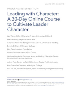 This article introduces Leading with Character, an innovative online course designed to cultivate virtues of character as the foundation of effective and ethical leadership. Developed collaboratively by the Oxford Character Project at the University of Oxford, the Human Flourishing Program at Harvard University, the Legatum Foundation, and leadership experts and educators from around the world, the course addresses the urgent need for leaders to cultivate virtues, such as purpose, courage, love, and hope in order to successfully navigate today’s complex challenges. The course is rooted in academic research in character and leadership development, combining academic rigor with practical application. It includes reflective exercises, real-world examples, and habit-forming practices through which participants develop the personal qualities and inner strength essential for leading positive change. The course is organized into four thematic modules, each focusing on a key leadership virtue. By blending theoretical insights with actionable exercises, the modules guide participants to reflect on personal values, enhance leadership qualities, and drive meaningful change in their communities. Leading with Character aspires to foster a global community of leaders dedicated to advancing the common good through character-based and purpose-driven leadership. By placing character at the heart of leadership development, the course offers a transformative framework that equips individuals to make a positive impact on their organizations and broader society.