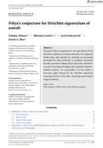 Filonov, N., Levitin, M. ORCID: https://orcid.org/0000-0003-0020-3265, Polterovich, I. and Sher, D. A. (2026) Pólya's conjecture for Dirichlet eigenvalues of annuli. Journal of the London Mathematical Society, 113 (2). e70425. ISSN 1469-7750 doi: 10.1112/jlms.70425