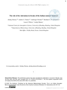 Deoras, A. ORCID: https://orcid.org/0009-0006-5407-6520, Turner, A. ORCID: https://orcid.org/0000-0002-0642-6876, Volonte, A. ORCID: https://orcid.org/0000-0003-0278-952X, Schiemann, R. ORCID: https://orcid.org/0000-0003-3095-9856, Wilcox, L. ORCID: https://orcid.org/0000-0001-5691-1493 and Menon, A. ORCID: https://orcid.org/0000-0001-9347-0578 (2026) The role of dry intrusions in breaks of the Indian summer monsoon. Journal of Climate. ISSN 1520-0442 doi: 10.1175/JCLI-D-25-0004.1