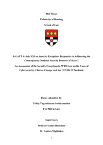 Soobramanien, T. Y. (2026) Is GATT Article XXI on security exceptions responsive to addressing the contemporary national security interests of States?: an assessment of the security exceptions in WTO law and in cases of cybersecurity, climate change, and the COVID-19 pandemic. PhD thesis, University of Reading. doi: 10.48683/1926.00128070